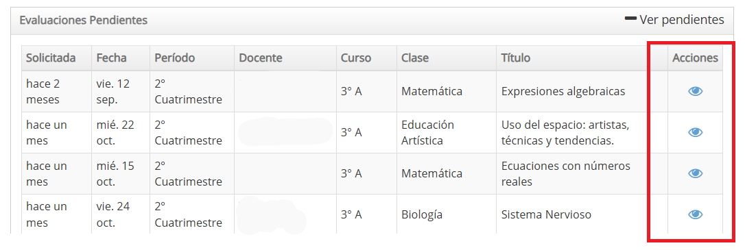 Haciendo clic en el ojo celeste a la derecha del detalle de información pendiente, podrán ingresar directamente a la evaluación o planilla de asistencia aún no cargada: