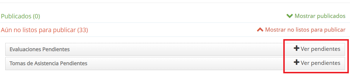 En caso de que aparezcan evaluaciones y/o tomas de asistencias pendientes, podrán hacer clic en el botón +Ver Pendientes para ver el detalle de la información aún no cargada: