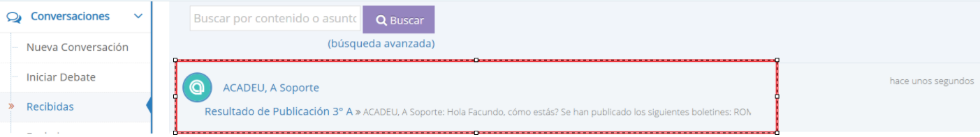 Minutos después, les llegará un mensaje automático de Acadeu informando si los boletines se publicaron exitosamente o hay calificaciones pendientes de cargar/aprobar. Te recomendamos ingresar desde el menú lateral Conversaciones -> Recibidas para chequear si recibieron la notificación de Acadeu: