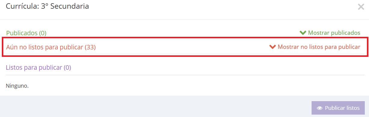 En caso de que aparezcan "Aún no listos para publicar", deberán hacer clic en la flecha hacia abajo para ampliar el detalle de la información pendiente: