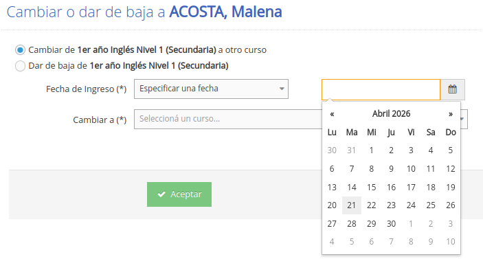 Seleccionás si desde principio de ciclo lectivo o desde una fecha en particular deja de cursar en ese curso -> Aceptar.