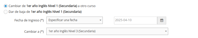 Luego, en el próximo selector, deberán indicar a qué curso/grupo se va a cambiar el alumno/a: