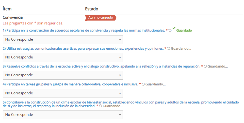 Según la materia, encontrarán los ítems correspondientes según el boletín oficial vigente en el apartado “ítem” y haciendo clic en los casilleros “Elija una opción” se le desplegará las opciones que tendrán disponibles para calificar a los alumnos: