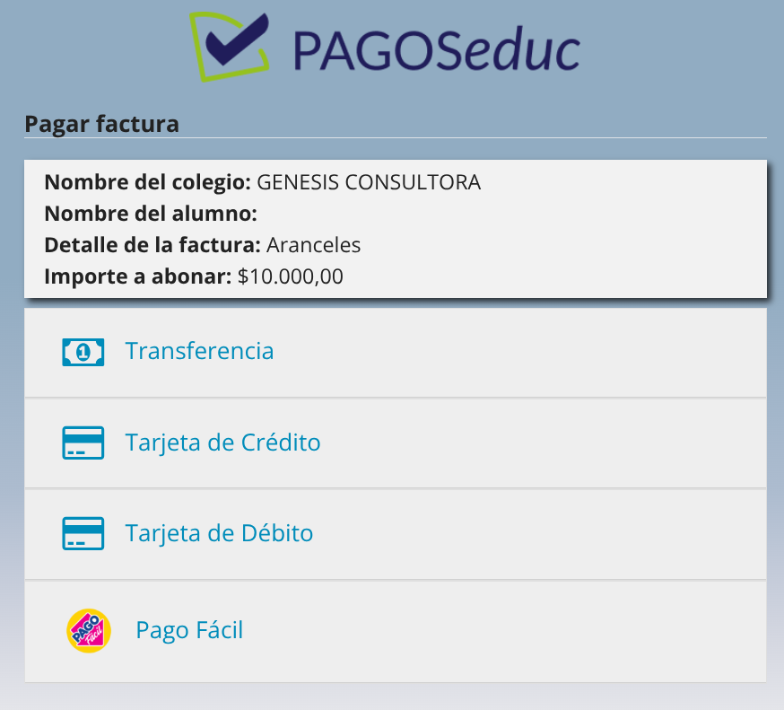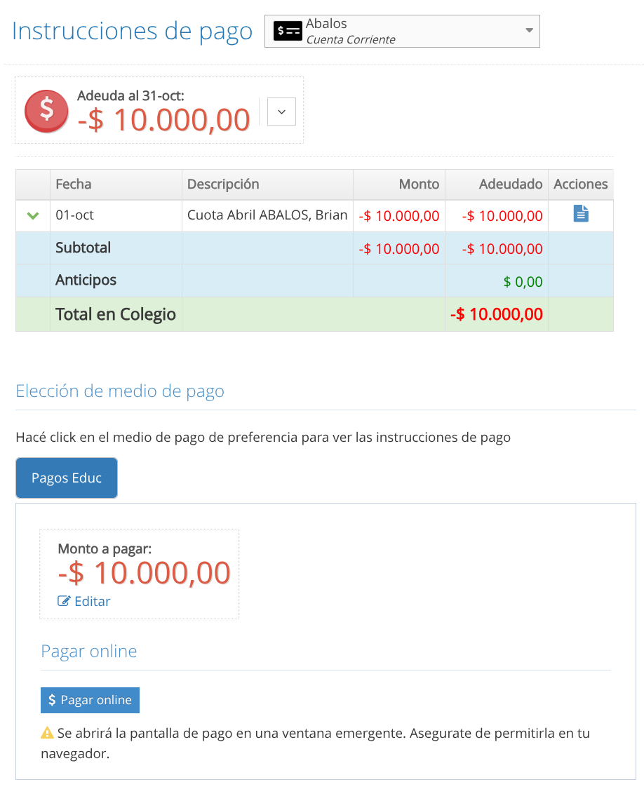 Al hacer click en "Pagar online" se mostrará la pantalla de Pagos Educ:
