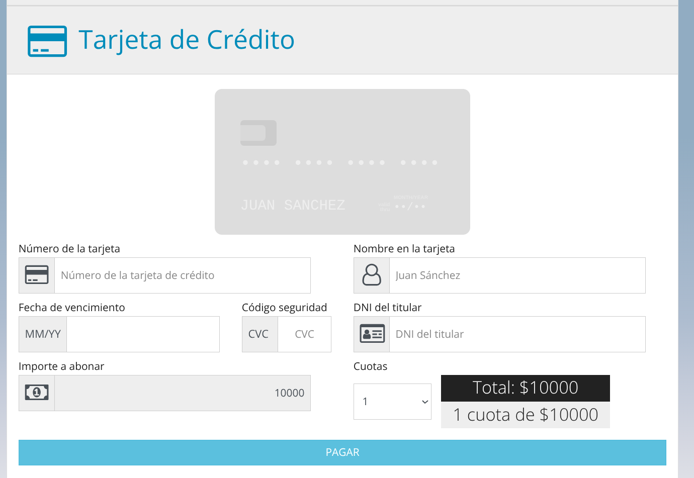 Si por ejemplo elegimos tarjeta de crédito veremos el siguiente formulario para ingresar la información: