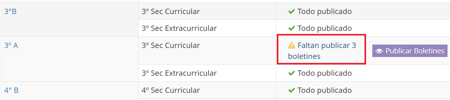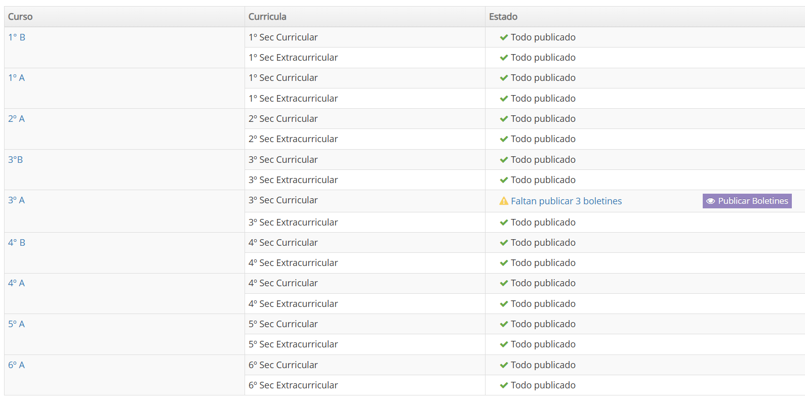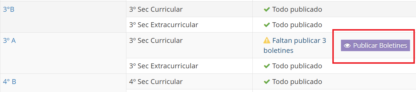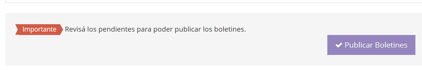 Podrán publicarlos haciendo clic directamente en el botón violeta "Publicar Boletines" a la derecha del curso en el que queden boletines pendientes de publicación.