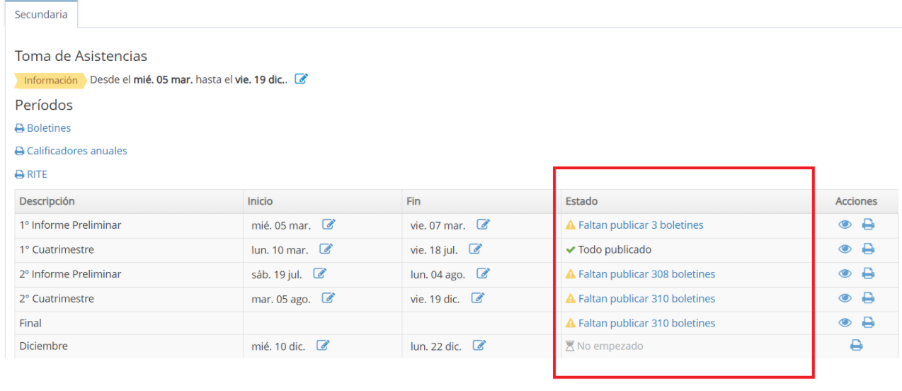 Encontrarán listados los períodos con las fechas y en la última columna "Estado" el número de boletines que faltan publicar. En caso de que todos los boletines del período están publicados, aparecerá "Todo Publicado"
