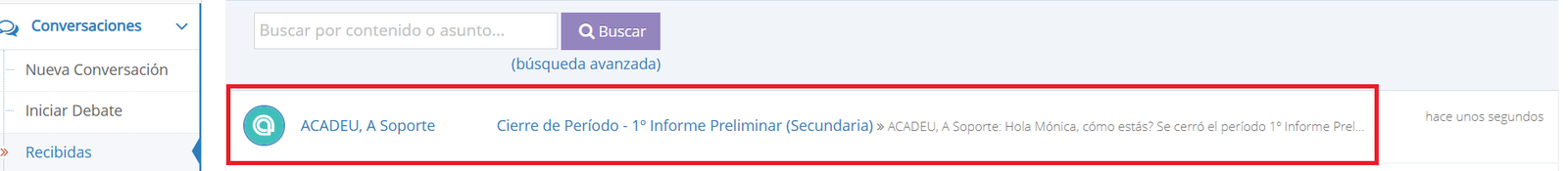 Minutos después, les llegará un mensaje automático de Acadeu informando si los boletines se publicaron exitosamente o hay calificaciones pendientes de cargar/aprobar. Te recomendamos ingresar desde el menú lateral Conversaciones -> Recibidas para chequear si recibieron la notificación de Acadeu: