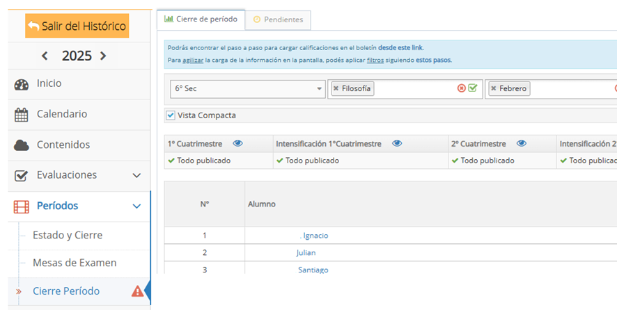 Para trabajar con el Período de Acreditación e Intensificación de Febrero Ciclo Lectivo 2025, deberán ingresar desde el Modo Histórico (botón amarillo del costado superior izquierdo)
