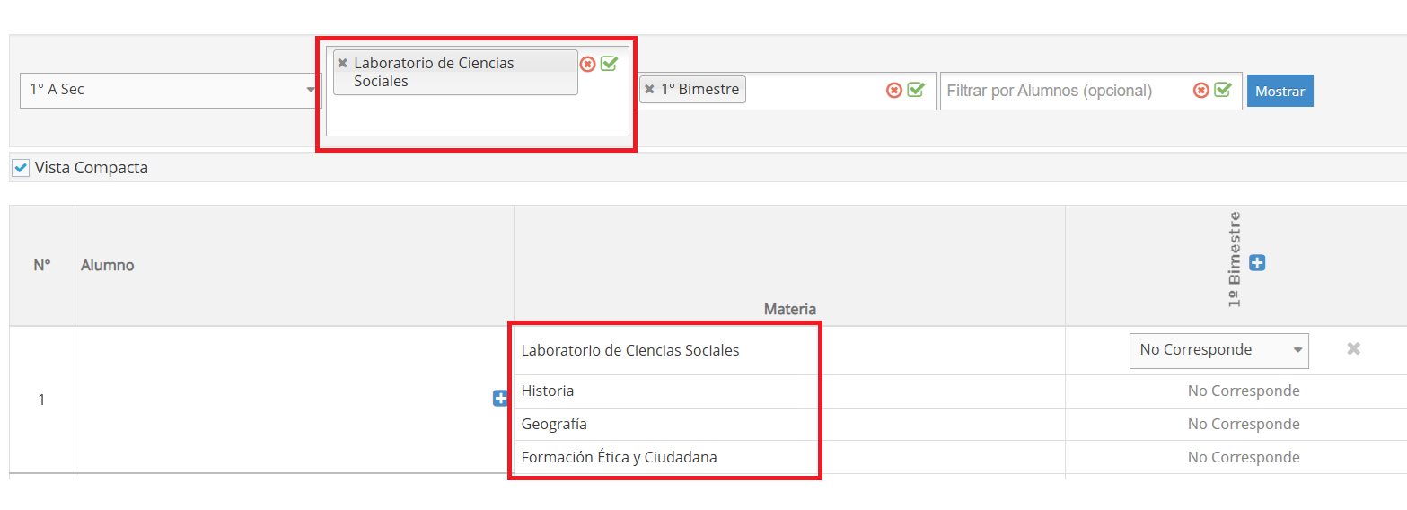 La visualización de las materias que integran el Laboratorio, sólo es interna para los docentes y directivos del colegio. Las familias no verán el desglose de materias en ninguna pantalla de Acadeu ni en el boletín web e impreso.