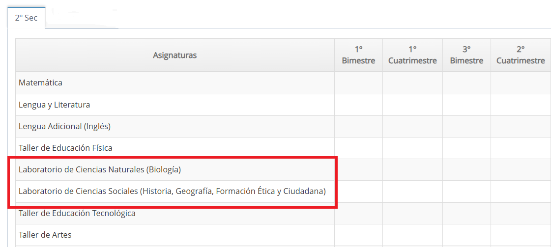 Tanto en el boletín web como en su versión impresa, aparecerán enumeradas las materias, talleres y, en el caso de los laboratorios, su nombre y entre paréntesis las asignaturas que lo componen.