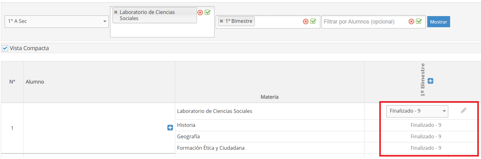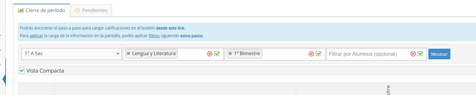 Deberán seleccionar el curso, período y clase -> Clic en Mostrar: