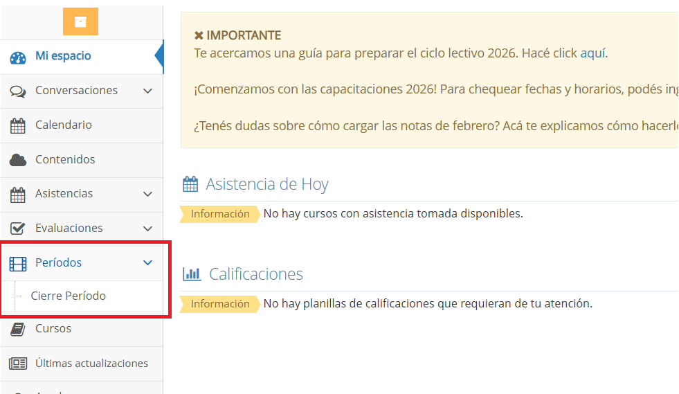 Para cargar las calificaciones, los docentes deberá ingresar desde el menú lateral izquierdo Períodos -> Cierre de Períodos: