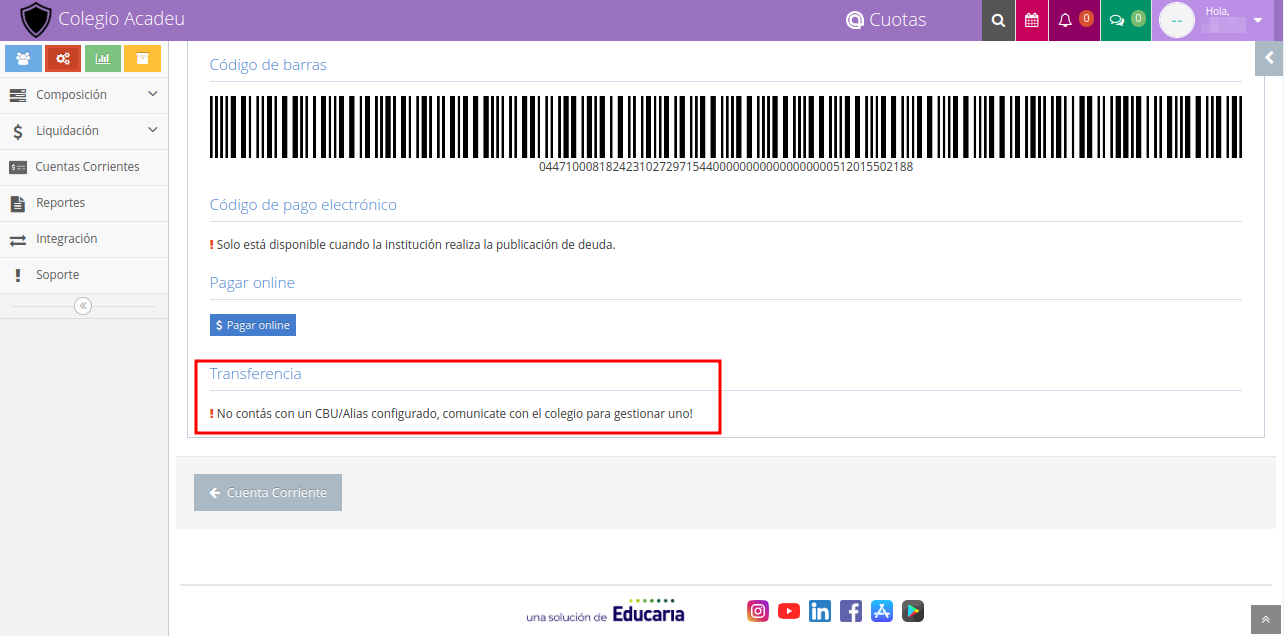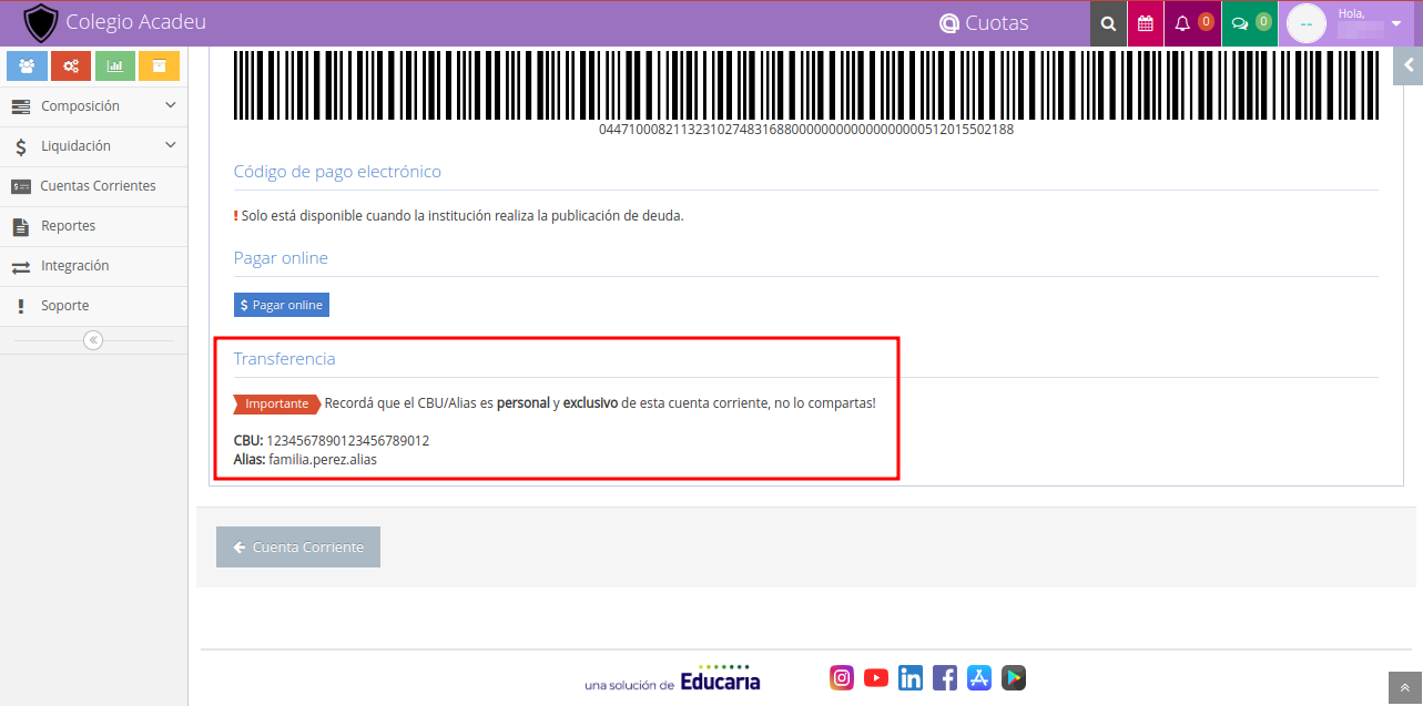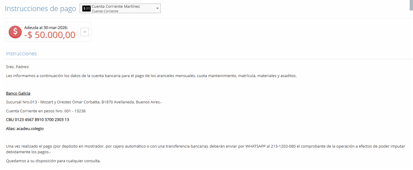 Se puede configurar para que en las instrucciones de pago todas de las cuentas corrientes aparezcan los datos bancarios de la Institución como el número de sucursal, tipo de cuenta corriente, CBU y alias, para que los titulares realicen los pagos por transferencias e indicarles también los medios de contactos para que envíen sus comprobantes de pago.