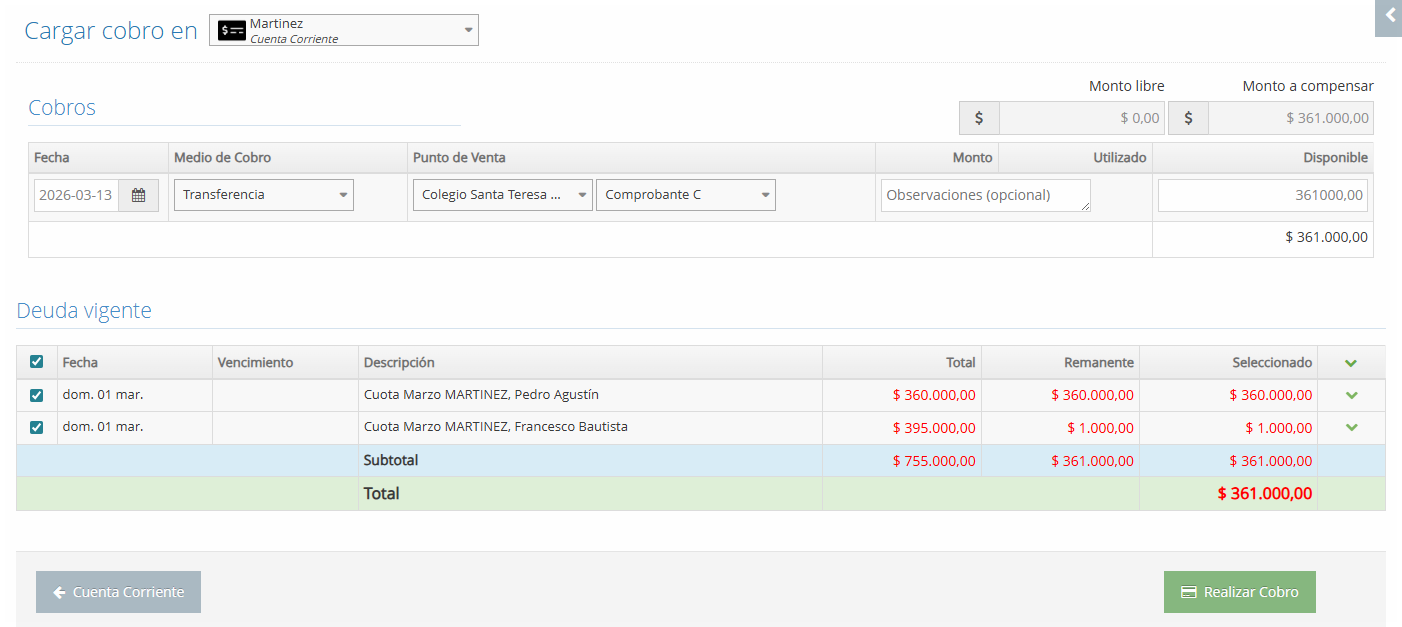 Una vez recibido el pago, el equipo administrativo de la Institución deberá ingresar a la cuenta corriente de la familia y registrar el pago manualmente, detallando la fecha, medio de cobro (transferencia), seleccionando el punto de venta, el importe abonado y las deudas vigentes a imputar:
