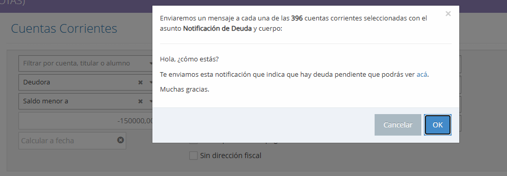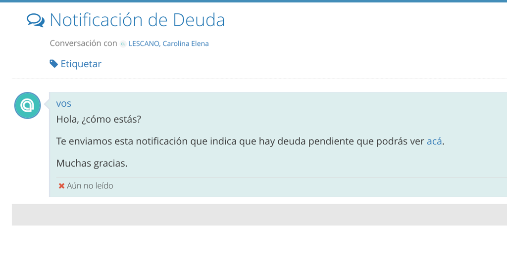 La notificación de deuda permite enviar mensajes automatizados a los titulares de las cuentas corrientes que tengan deuda.