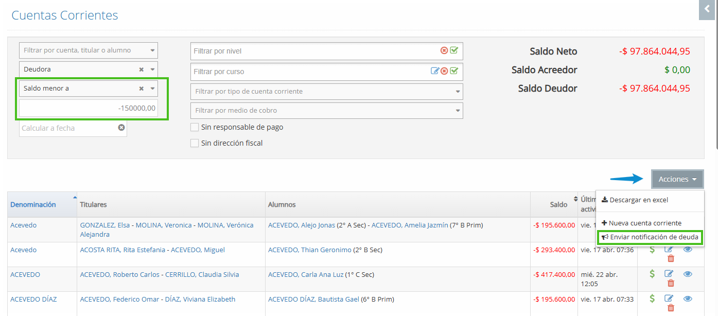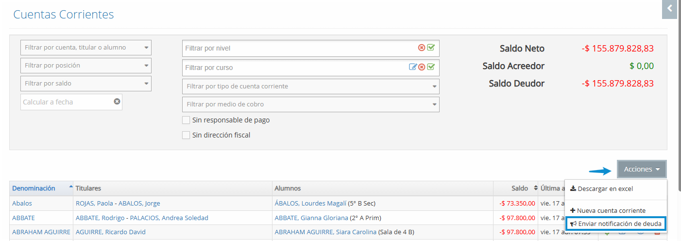 La opción de enviar la notificación de deuda aparece en la pantalla de cuentas corrientes presionando el botón de acciones: